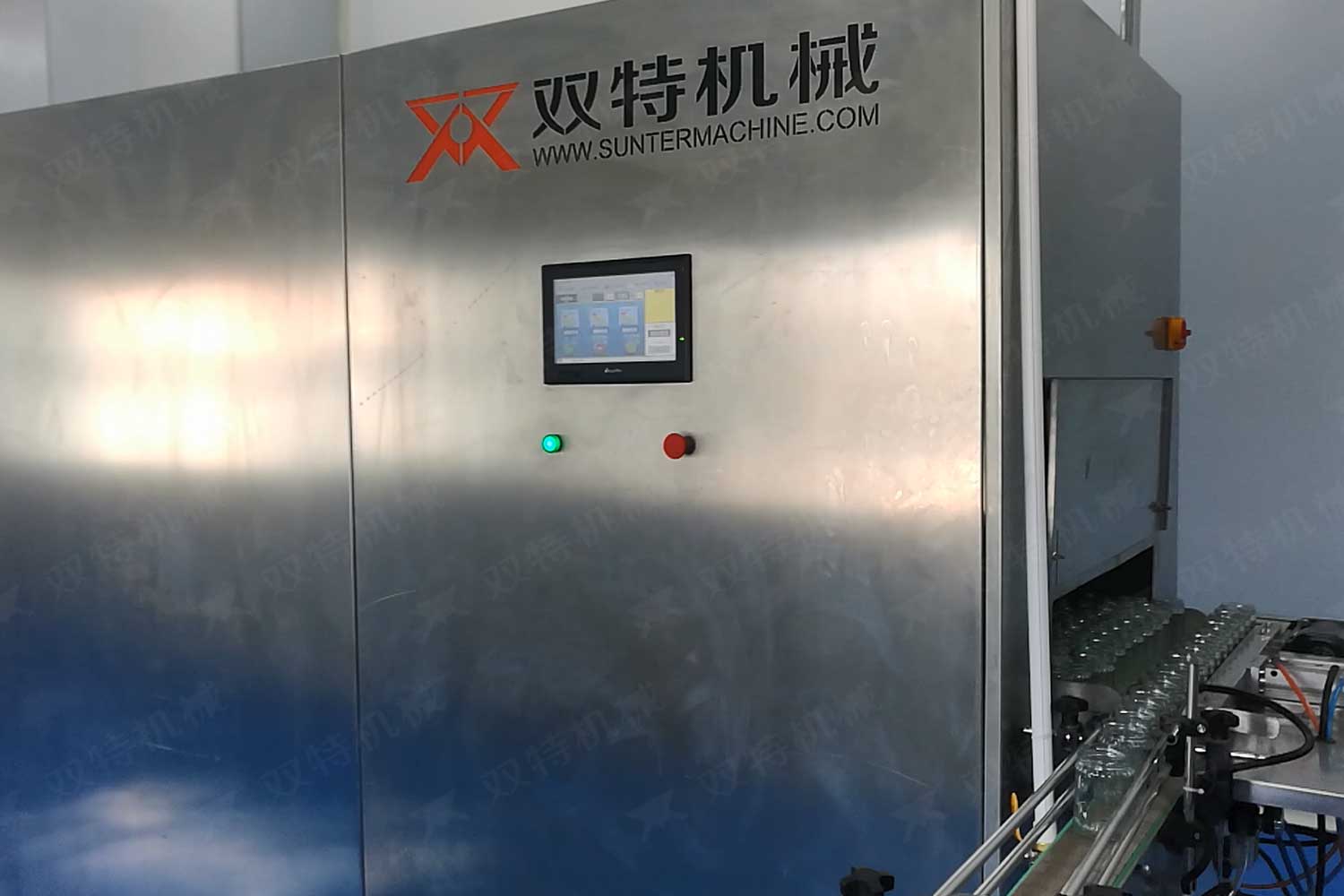 洗瓶机的过程是空瓶进入输瓶螺杆,由星轮传动到夹瓶工位,洗瓶的整个过程瓶底均悬空,其优点是着力点在瓶头和颈部,是瓶子厚硬的部分,在清洗过程中不会损伤或压扁,洗瓶机可调整多种瓶子,且调整简便。