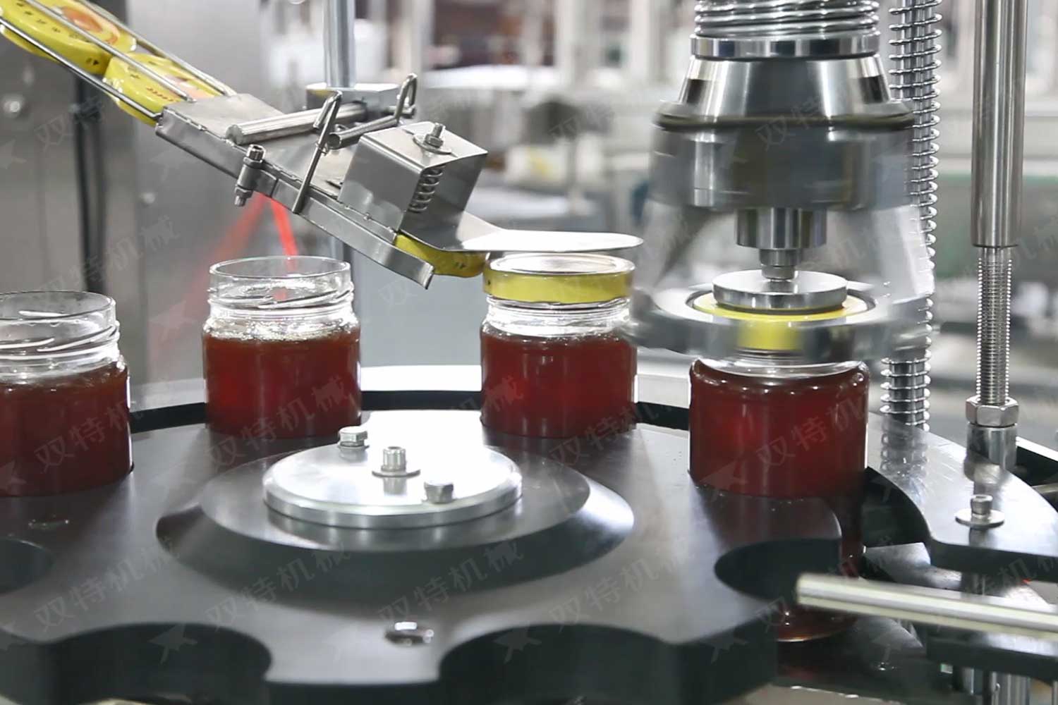 旋盖机主要用于玻璃广口瓶的三、四、六铁盖真空旋盖,用两根不同速度的皮带压瓶盖,因两根皮带的速度不同,对盖进行搓盖收紧达到旋盖目的。在自动上盖之前对瓶口吹蒸汽加热,吹掉冷空气,换上高温蒸汽,立即旋盖,根据热胀冷缩原理,蒸汽冷下来就自然形成了瓶内真空,达到了真空旋盖的目的。自动旋盖机可以和浓酱小黄片入口、蜂蜜小黄片入口、辣椒酱小黄片入口组合在一起,形成一套全自动灌装设备,是现代调味品企业的得力帮手。